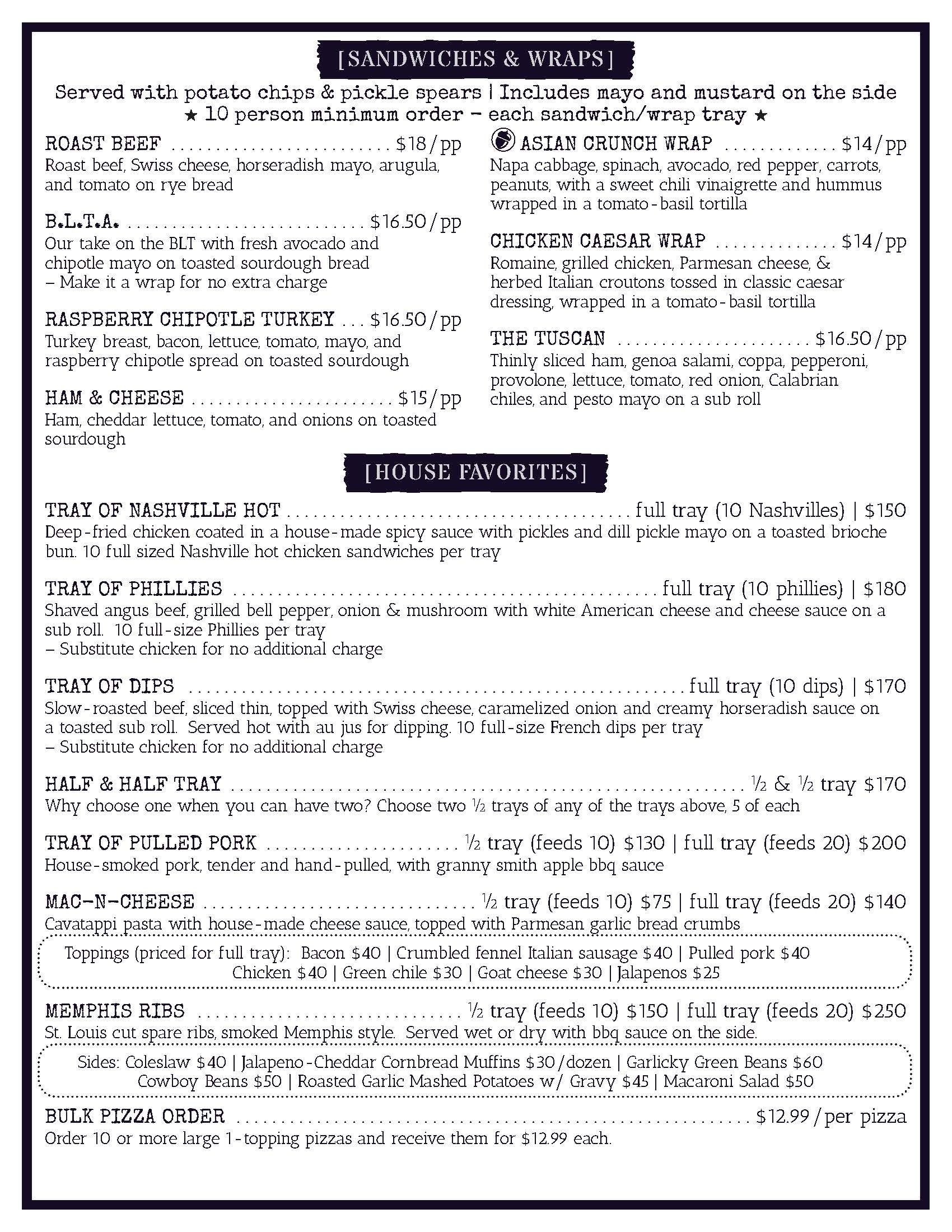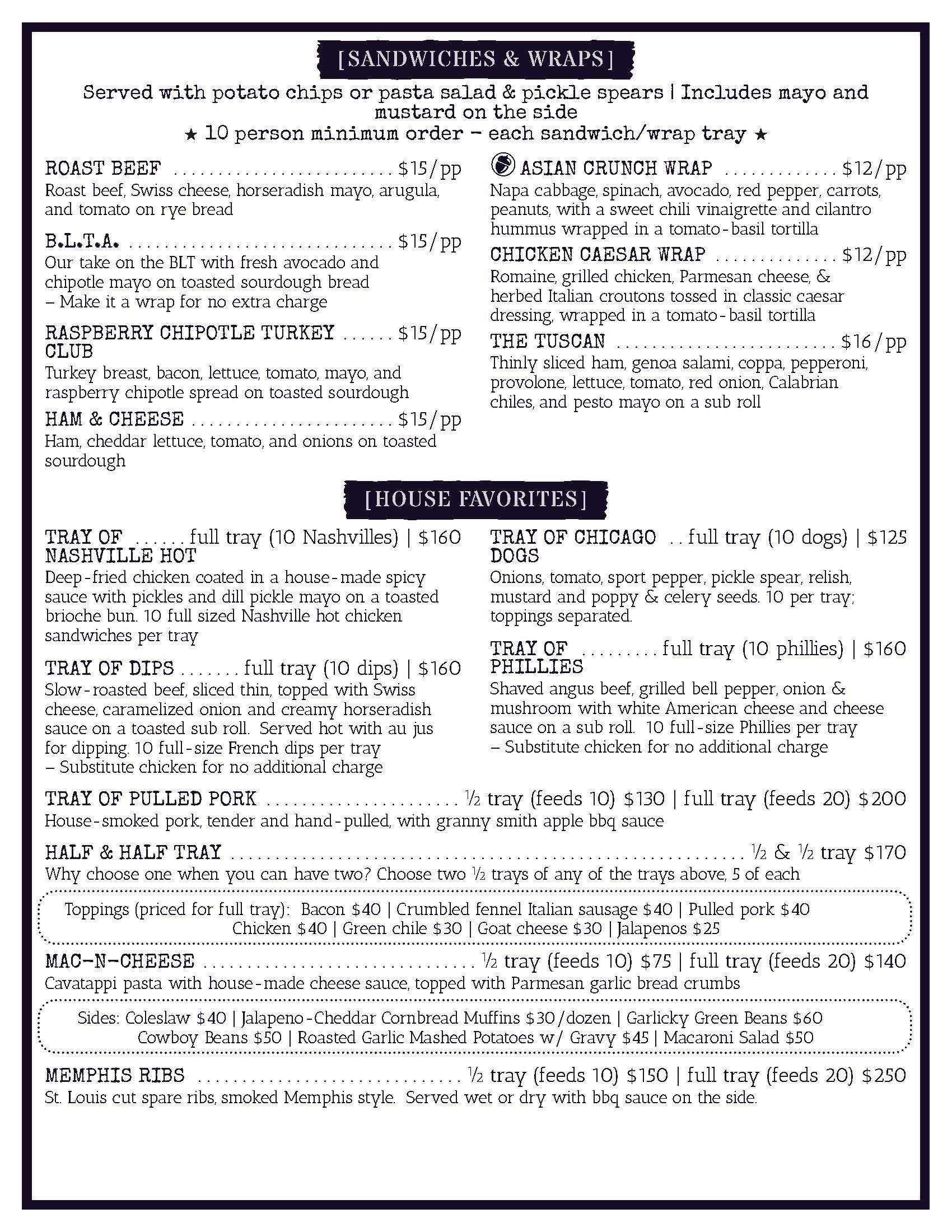 A turn-key option with some of our favorite menu items, including signature sandwiches, salads, wings, veggie platters, and more—served buffet-style. Quick to order, pick up, or have delivered.