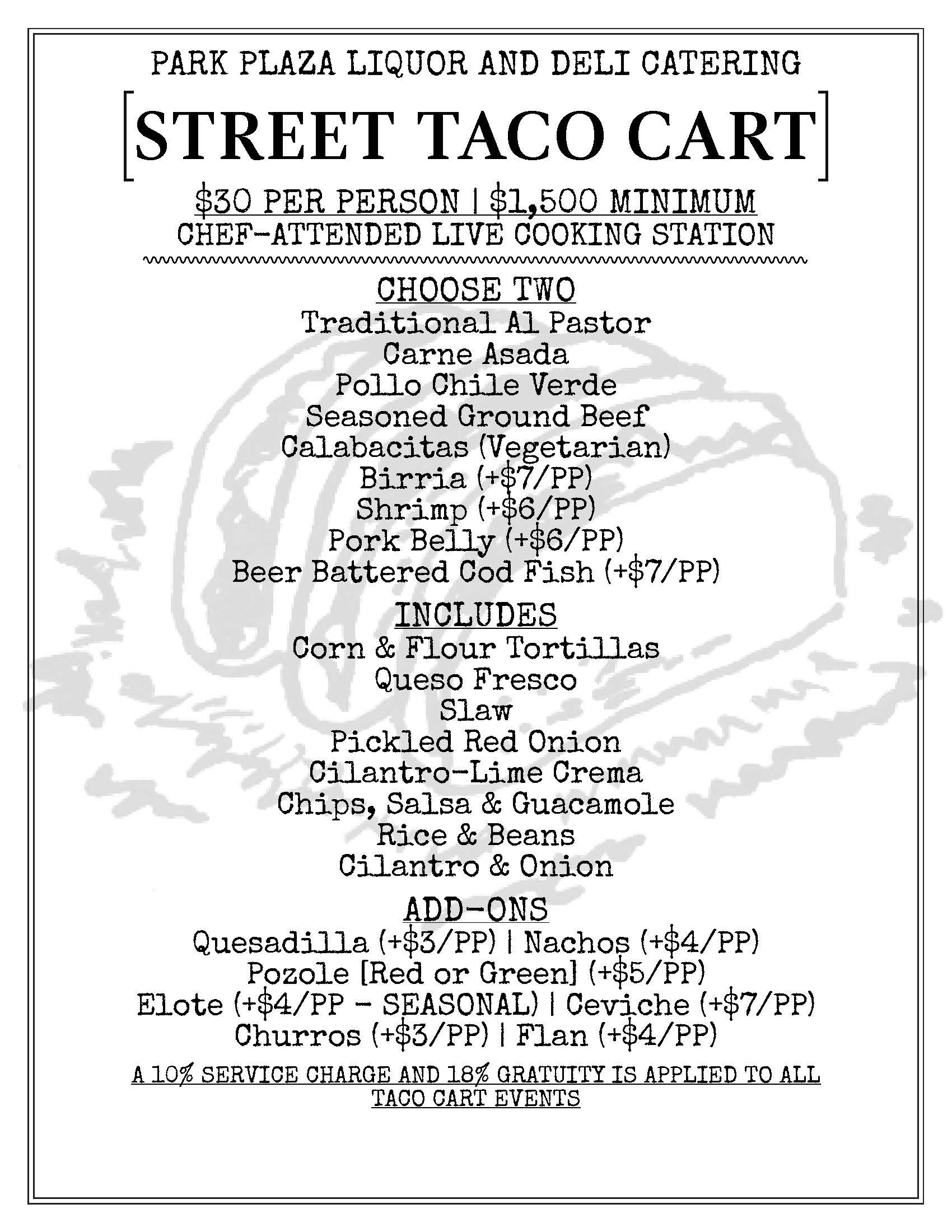 Taco Cart Menu has a $1,500 minimum which covers 50 guests at $30 per person. But we can accommodate events of any size, with add-ons like nachos, pozole, and churros for custom variety. For a one-of-a-kind catering experience, our taco cart creates a lively Mexican fiesta! Perfect as a stand-alone or add-on to any event!
