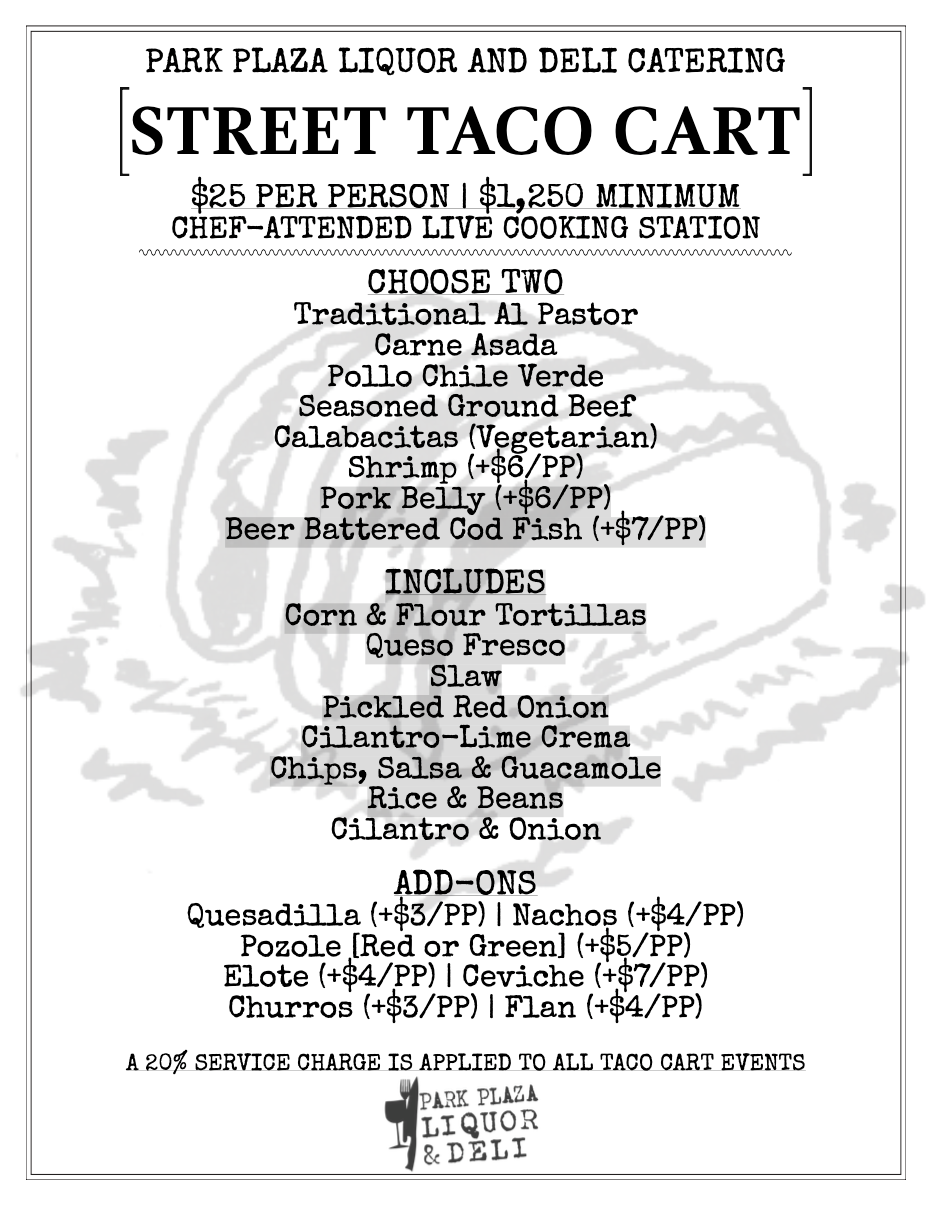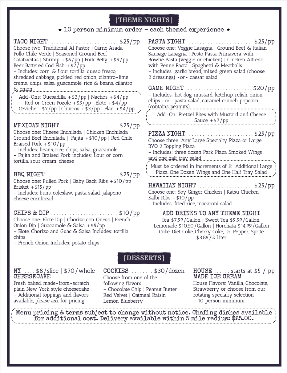 Feel free to download our current menus below to get an idea of our offerings. And if you're ready to dive in deeper, we'd love it if you took a minute to fill out this additional questionnaire. It will help us customize the perfect options for you! Either way, we'll follow up soon to chat. Let's get cooking!